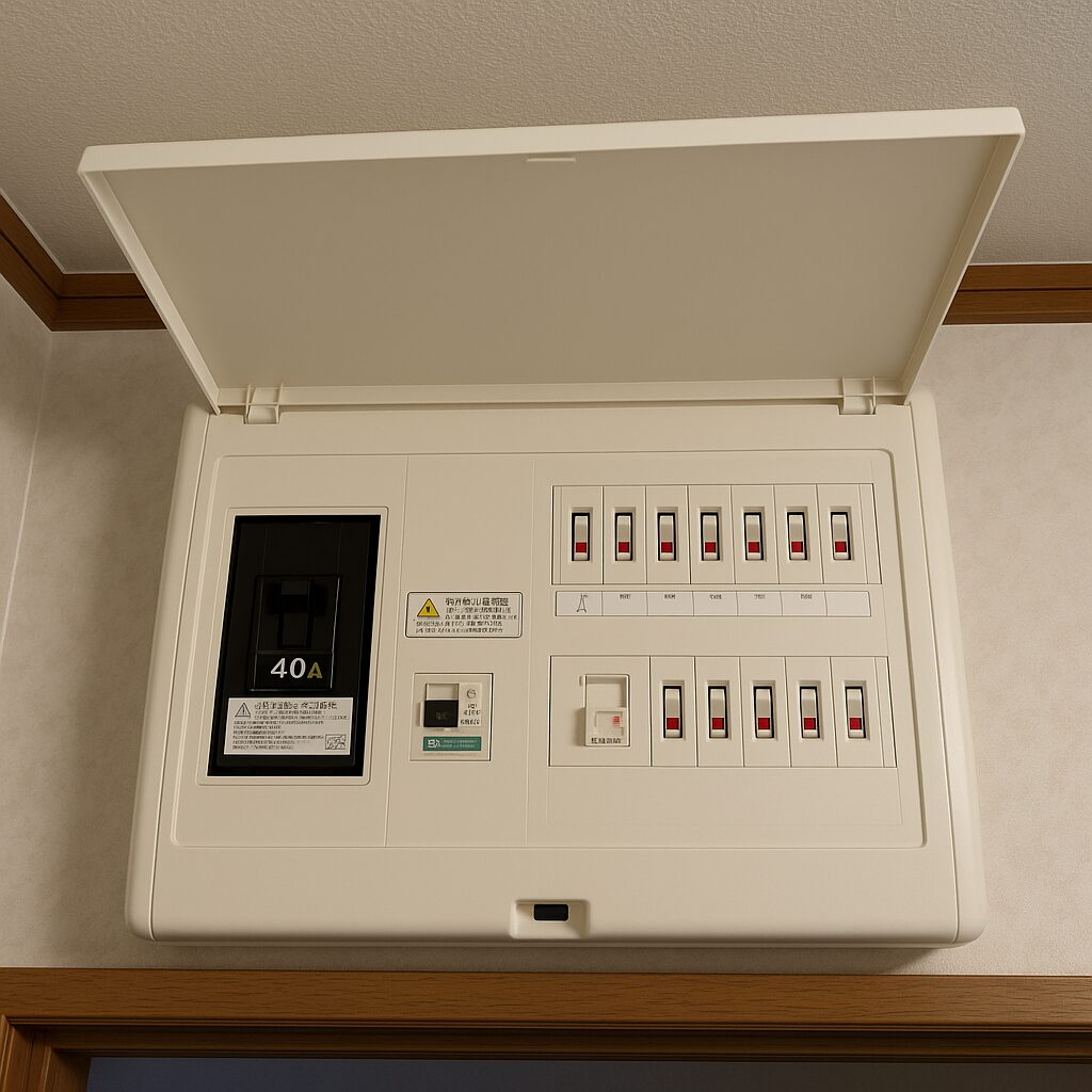 野田市の子育て世帯で分電盤の安全対策を行いました。築25年の住宅で漏電遮断器が未設置の回路が多く、感電や火災のリスクがありました。全回路に漏電遮断機能付きブレーカーを新設し、水回りにはアース付きコンセントも導入。工事後は「子どもがいても安心」とご夫婦から喜びの声をいただきました。