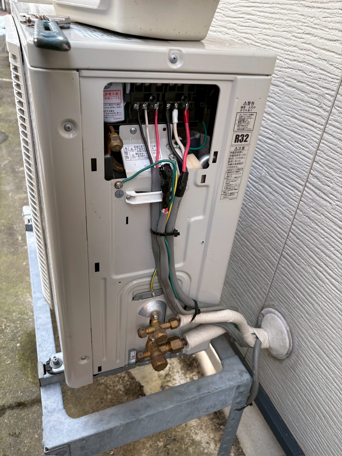 既存エアコンの取り外しから新規エアコンの取り付け、配管工事、室外機設置、真空引き作業まで丁寧に対応。配管カバーを使用することで、外観も美しく仕上げました。